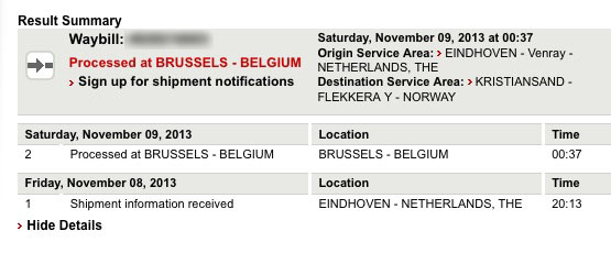 My order, which was despatched yesterday morning (ordered 25th), is now showing up in DHL's system... last seen in Brussels! Hope fully in Norway soon