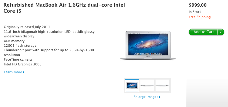 Just bought a refurbished 13" 128GB/4GB MacBook Air. So stoked! I already have the 27" Core i5 iMac for my primary photo editing, but the Air will serve as my field editing computer. It's an amazing machine. Should arrive next week.