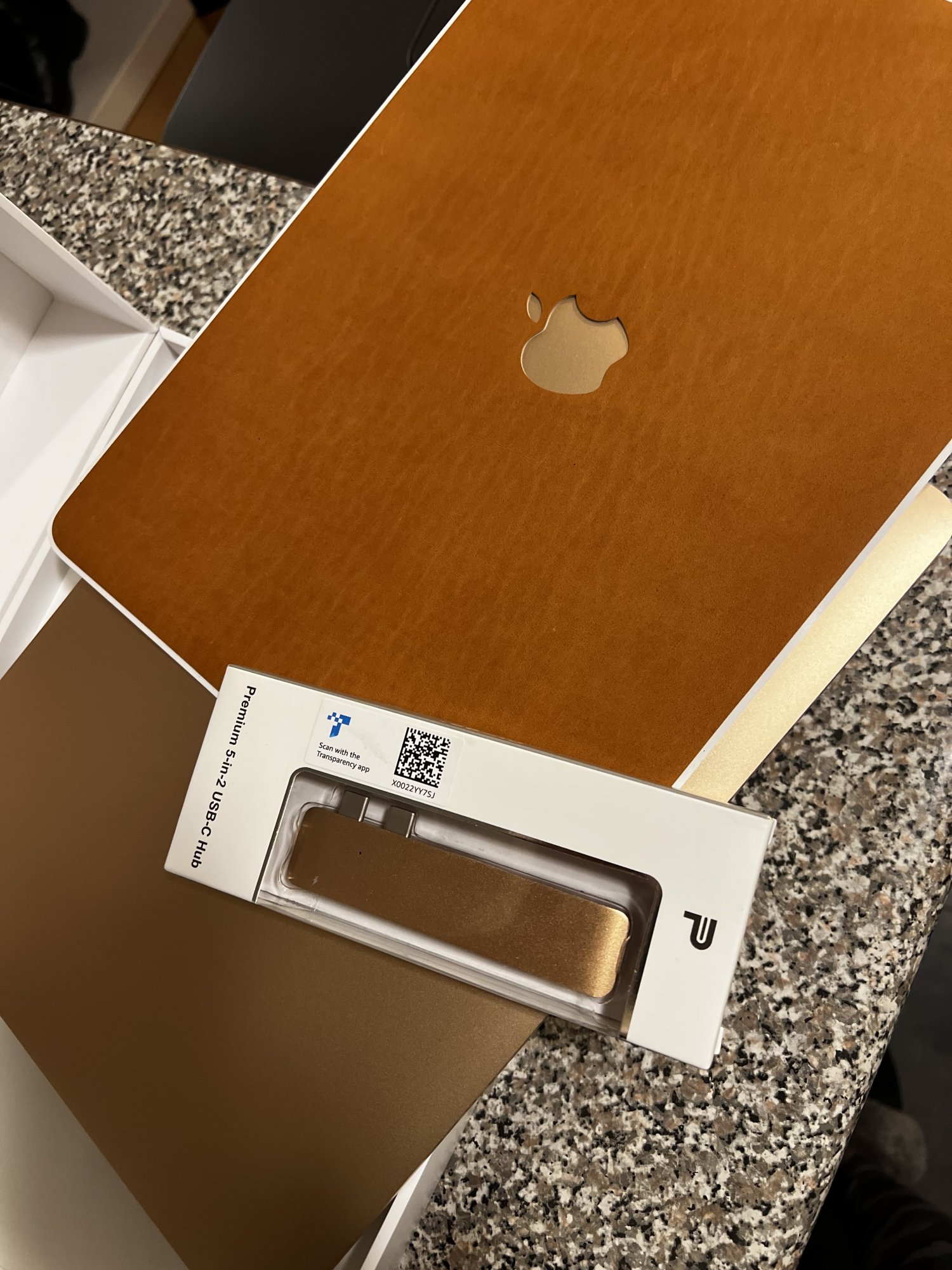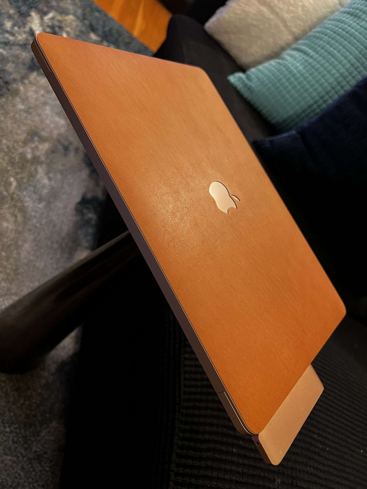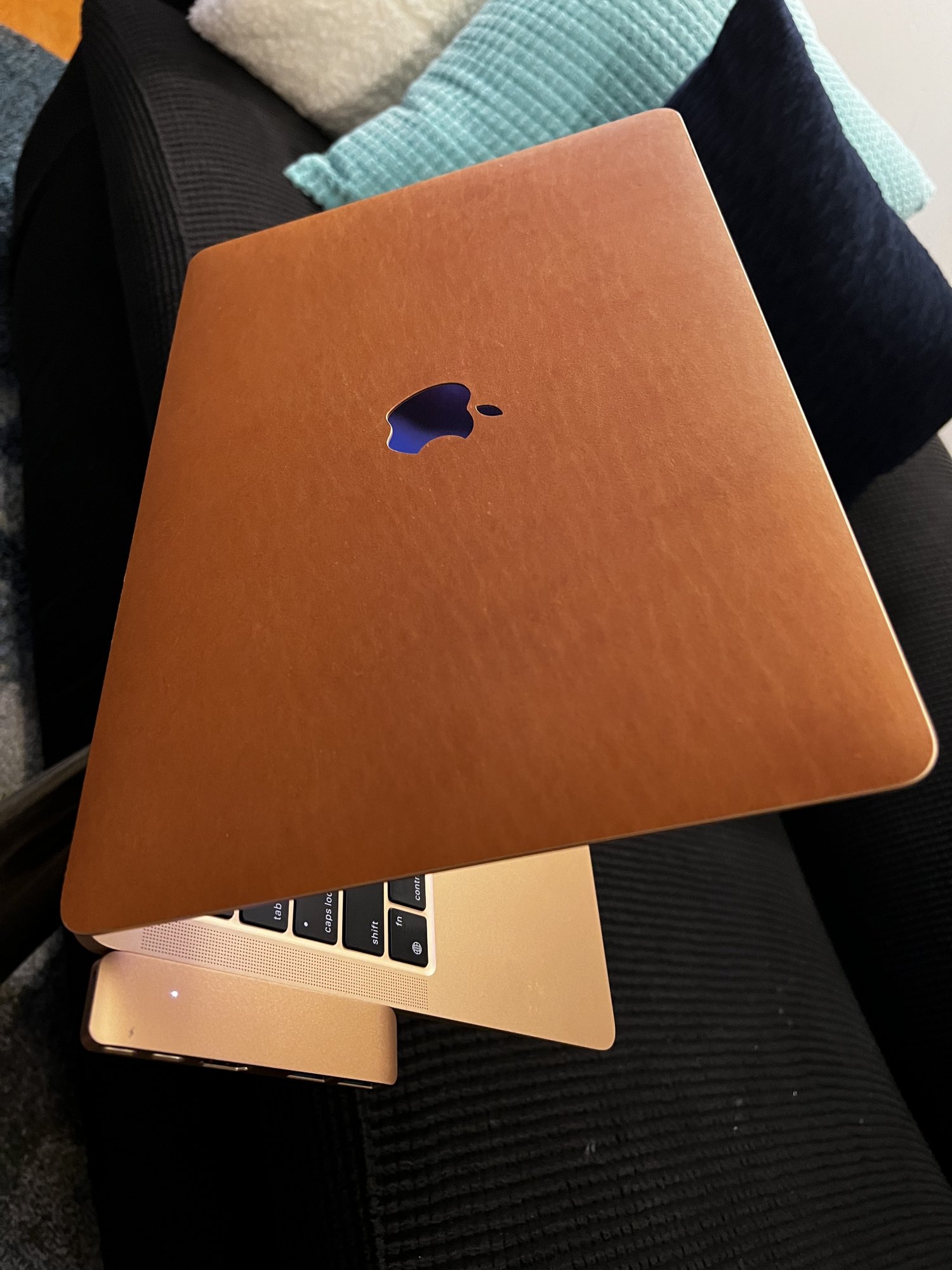 I've never use D-brand before. How hard is it to remove if you don't like it? A lot of glue?M1 8GB RAM and 1TB SSD. Dbrand leather skin. The gold is sooooo over the top and I’m so low key lol! I love it so much.