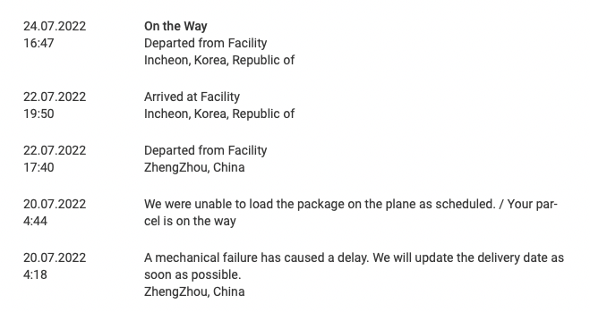 You’re SO lucky! Mine’s been stuck in Zhengzhou since Friday. No updates whatsoever since. What does your full tracking info look like? Did you have a departure scan from Zhengzhou or an arrival scan in Seoul/Incheon?