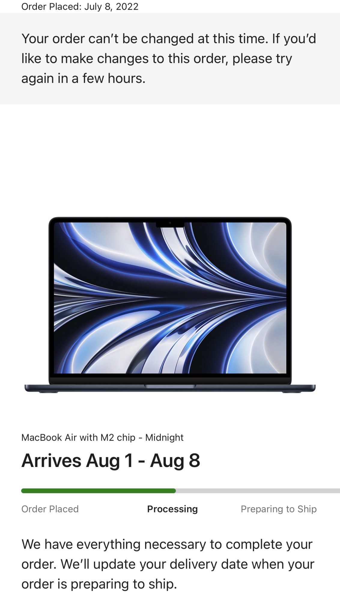 Silver 10C/16GB1TB ordered on July 12. Apple delivery estimate of July 21-28. Still stuck at processing. Last night, the wording changed to “We’re preparing your order and will notify you when it ships.” but the green line is still stuck at “Processing”. I guess I’ll be getting mine at the tail end of the estimated delivery :(