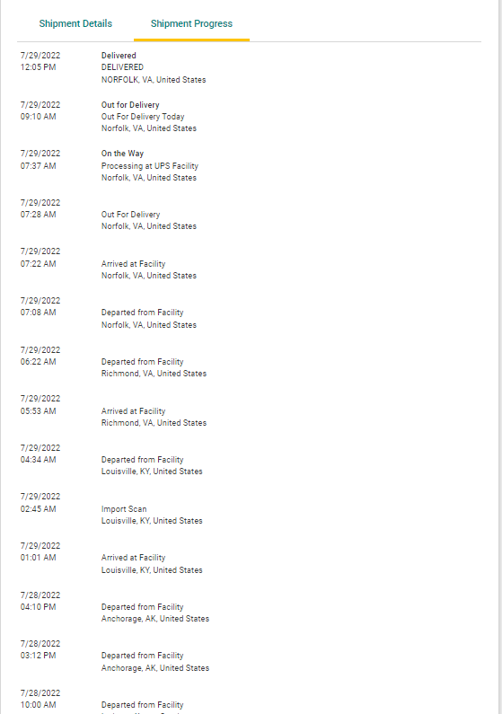 Midnight MBA 10/24/2 (fully loaded) ordered within 5 minutes of preorders at on the apple education site. Initial estimate was Aug 2-9. My apple card was eventually charged on (i believe) the 24th and within a day it was preparing for shipment. Est delivery was updated to Aug 1-8. Was shipped via UPS International saver or whatever it's called. Initial estimate when UPS got the label on the 25th was Aug 29. Below is the shipping progress pics. Throughout the course, apple held steady on ship date. UPS would change from the 29th to 27th to 28th depending on whatever the system felt like putting in (LOL I'm sure it was probably some system estimate, but it didn't seem to correlate to anything). After it cleared customs in China, suddenly UPS said estimated delivery unknown, and my guaranteed window was canceled. That was on the app and details, however on the overview in the UPS my choice app it continued to show the 28th. Once it left Incheon and got to Anchorage, UPS updated the delivery day to the 29th. That ended up being correct. I live in a fairly major city (Norfolk, VA). I'll check back once or twice in the next few days in case anyone has any questions about my progress, but I hope this helps someone.