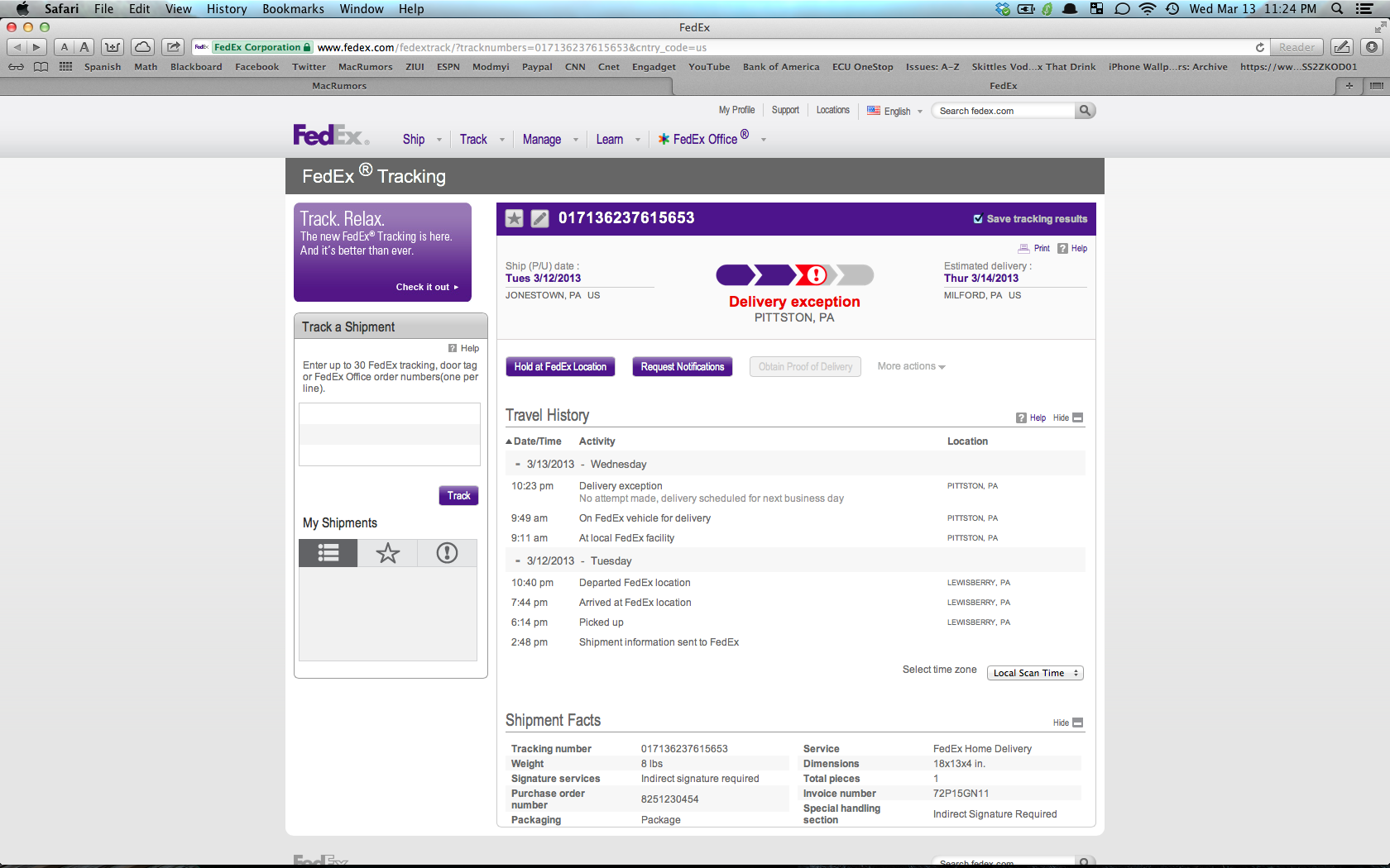 Edit: Pardon me while I vent. The RMBP that was scheduled for delivery today and was "on the truck for delivery" is still not here. Called FedEx and they said that today was an "estimated date" not a firm date and my package is being delivered by an independent contractor (person in a car) and will be delivered tomorrow. So my computer is sitting in some guy's car tonight probably a few miles from my house.