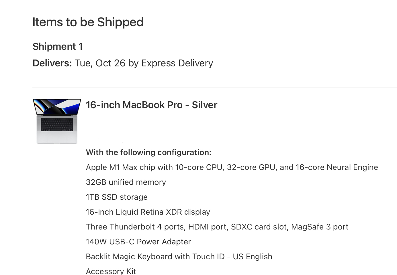 MacBook Pro 16 with 1 TB SSD and 32 GB of RAM. October 26. I hit reload on the website until I could order. Had two browsers open on two computers as one did die in the middle of the order so I started on the second computer. I hit reload on the first one and it eventually came back. I had a slight bit of remorse after placing the order thinking that I should have ordered a bit higher after seeing how many people here ordered the Max configurations but I can't justify more. The M1 is actually fine for me except for RAM and ports. The M1 Pro fixes those problems but I actually don't need that amount of CPU. I only need enough GPU to drive 2x4k external displays.