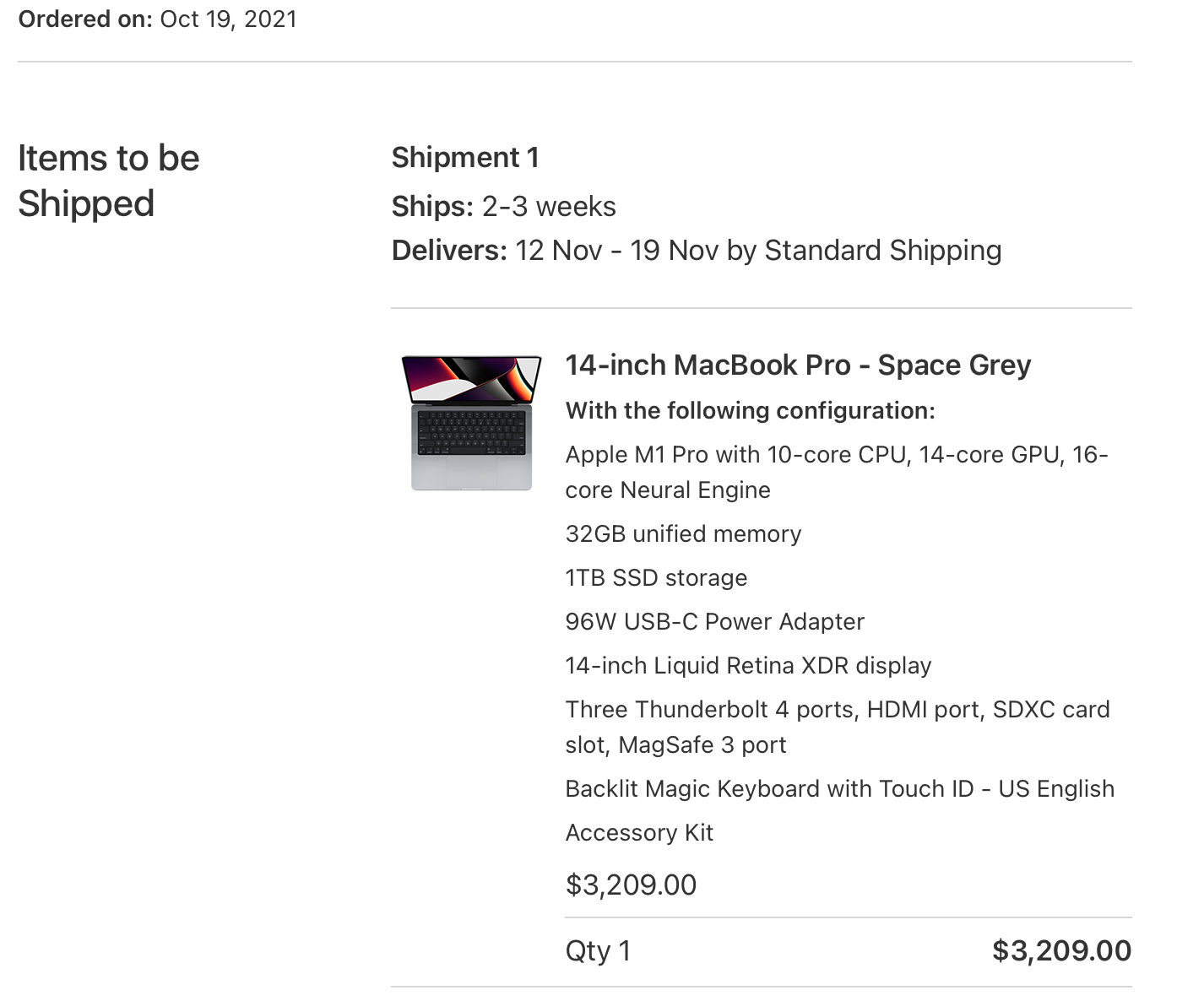 Ordered a 16" M1 Max with 64GB, 2TB about a half hour after the event concluded yesterday. Originally said it would ship December 10-23, but I got a notice this morning that the estimated ship date had changed to November 17-24, which is fantastic news.