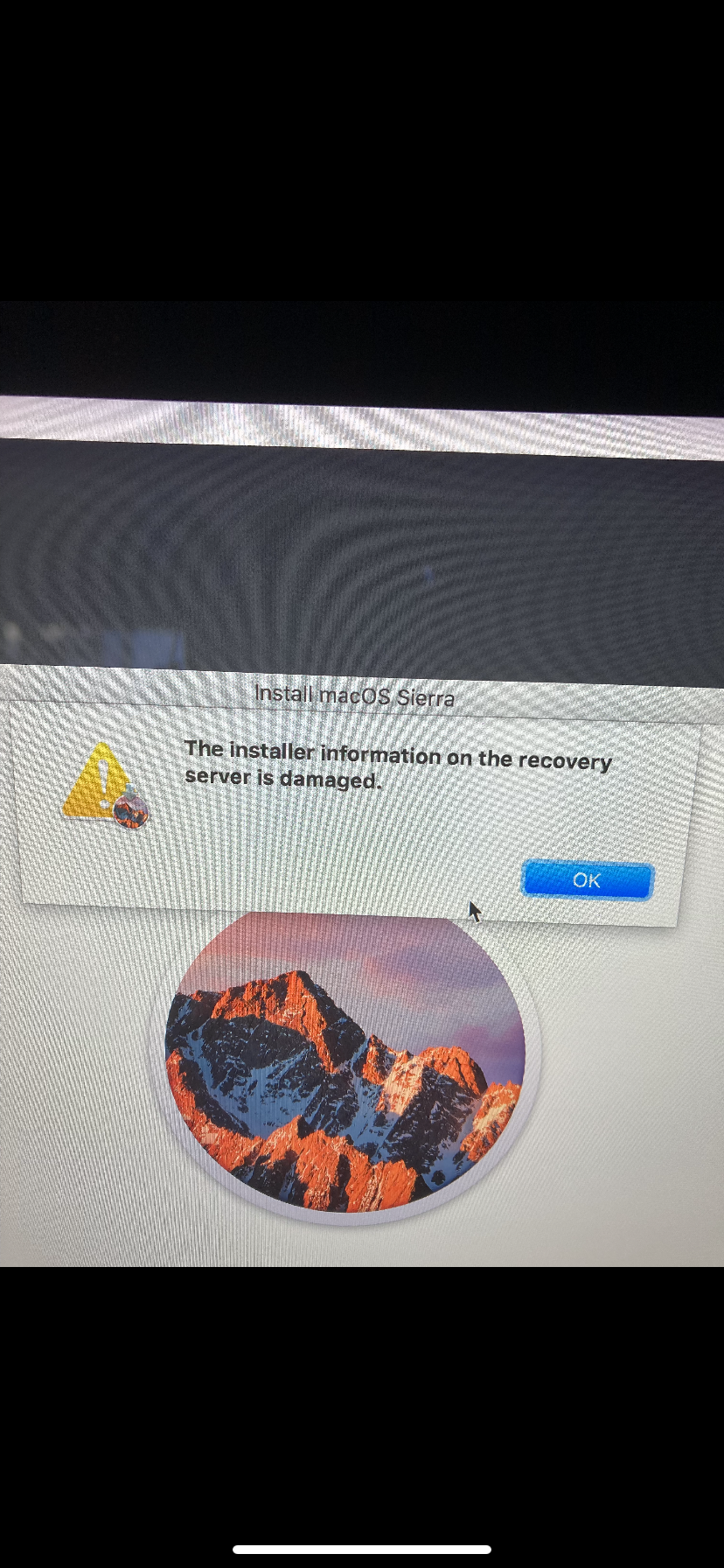 install MacOS. I erased the Hardrive in Disk Utility as per YouTube instructions but when I got to the 'Install MacOS Sierra', it won't let me download it and just comes up with the error "The Installer information recovery server is damaged". How do I fix this and continue on?