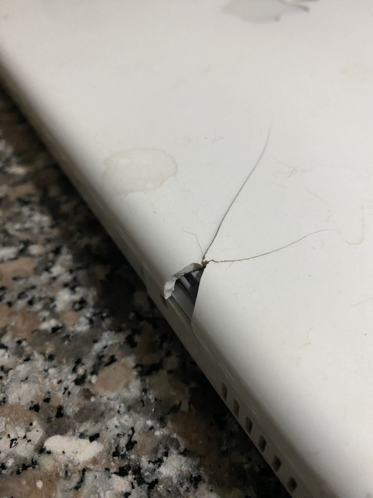 Apart from the heavy physical damage to the display's upper case, it was extremely dirty (the picture doesn't quite do it justice). Much of the crud likely came from the piece of crusty duct tape put over the camera, and physical pressure from it when closed over time is what also likely made the trackpad button go a little wonky. After heavy use of 99% isopropyl alcohol, however, I was able to get the machine looking almost pristine. Even the topcase plastic was in almost perfect condition. Until I actually broke the plastic trim while I was cleaning it. (Oh well, nothing a little Gorilla Glue won't fix...)