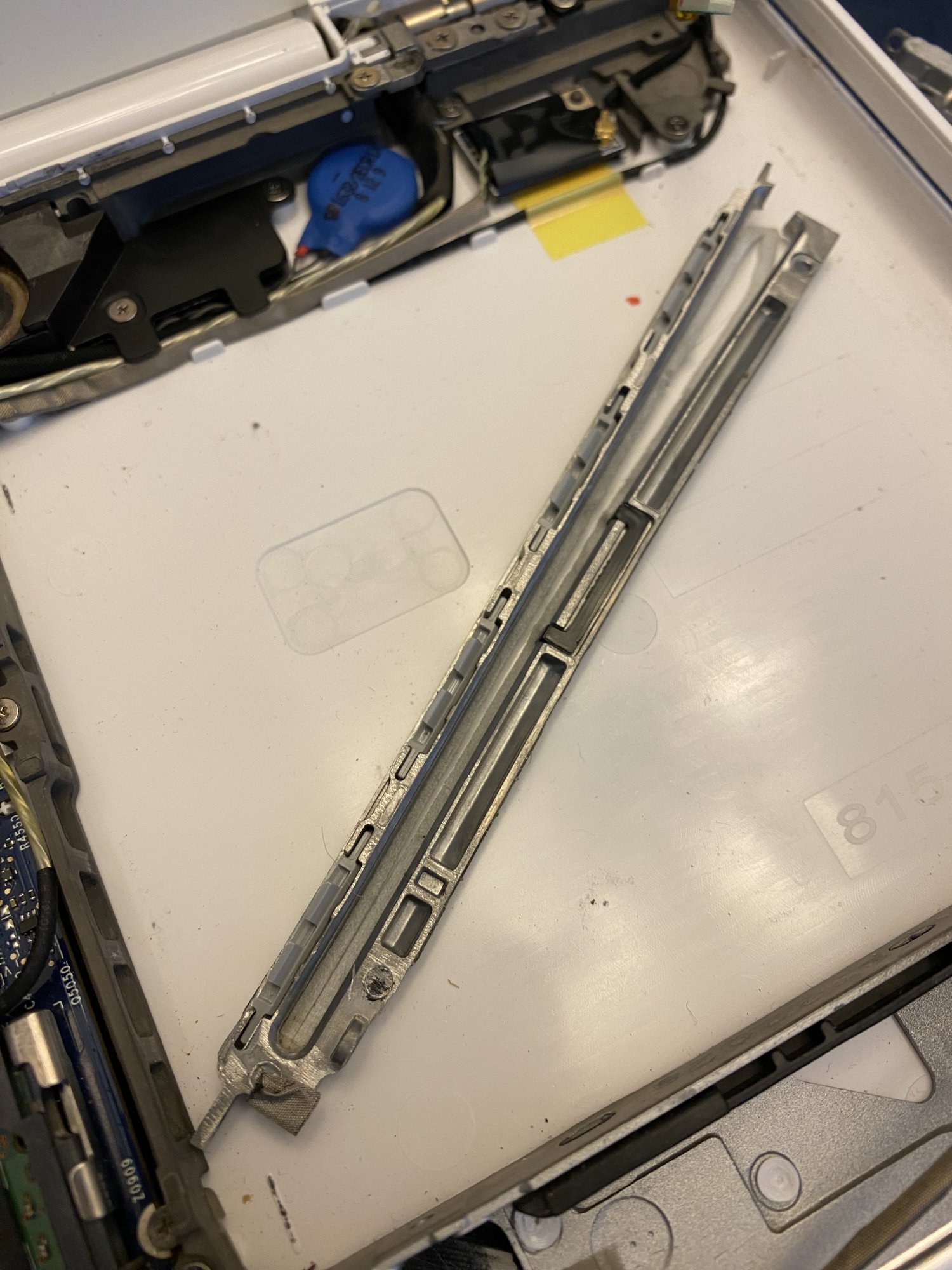 I couldn't insert a disk into the drive; I at first thought there was a disk already stuck inside. When I opened it up to replace the thermal grease I realized the culprit wasn't a disk stuck in the drive at all. In fact, the part of the magnesium chassis at the optical drive slot had been bent so much – likely due to being knocked around in a backpack – that it was physically blocking the insertion of disks. I tried to bend the bottom part back into shape and ended up accidentally snapping it. Oops.
