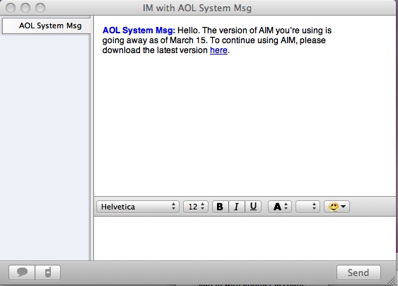 It lets me log in via my old email but this pops up disabling the app. Another weird thing is that my login which works for AIM and their website, does not work under ichat. What a PITA lol. Oh well, it was a nice trip down memory lane![]()