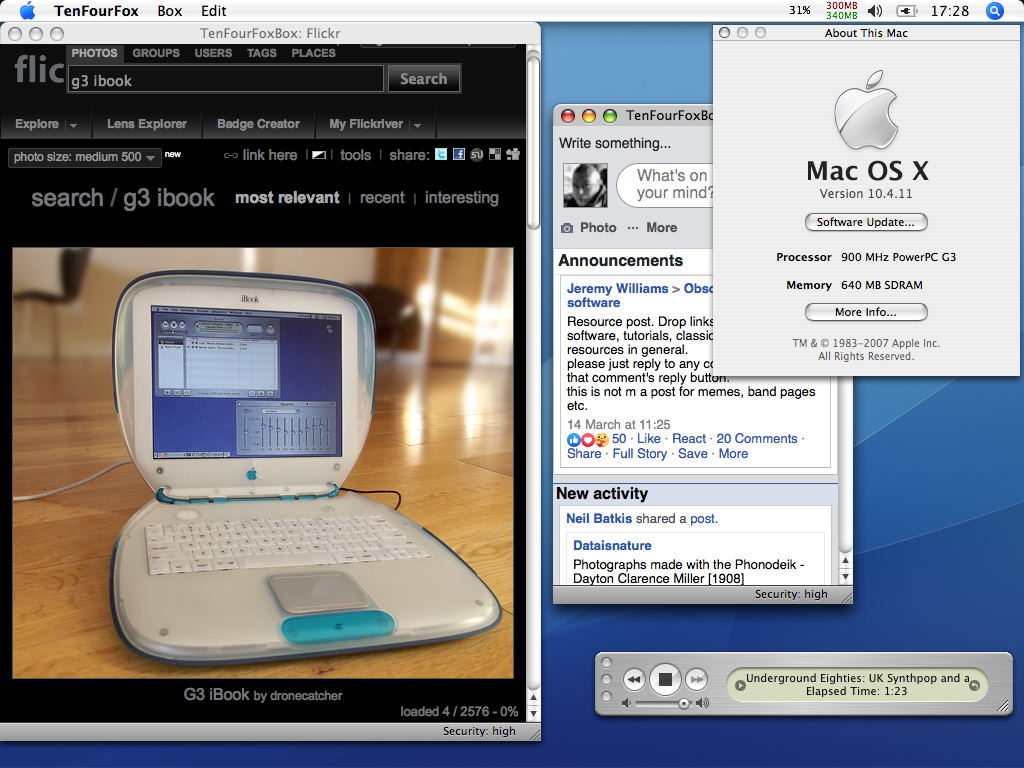 I think it's incredible that in 2021, using an 18 year iBook I can browse Flickr, keep an eye on Facebook and listen to SomaFM web radio with CPU cycles to spare!