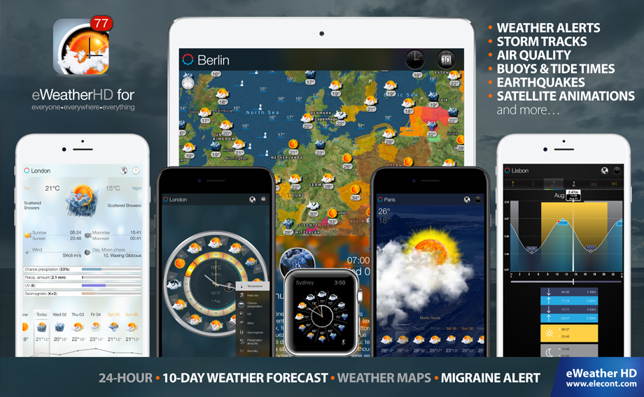 eWeather HD combines all possible weather information packed inside a beautiful user-interface and widgets. The app provides 10-day and hourly weather forecasts from multiple sources, severe weather alerts for U.S.A. (via PUSH) and European countries, high-resolution radar and satellite images, unique "weather clock" and 365-day graphics, multilayered, animated weather maps, temperature at beaches around the world, hour-by-hour weather forecast with UV levels, "Feels like" temperatures, rainfall/snowfall amounts, near-realtime data from over 600 NOAA buoys, earthquakes and much more.