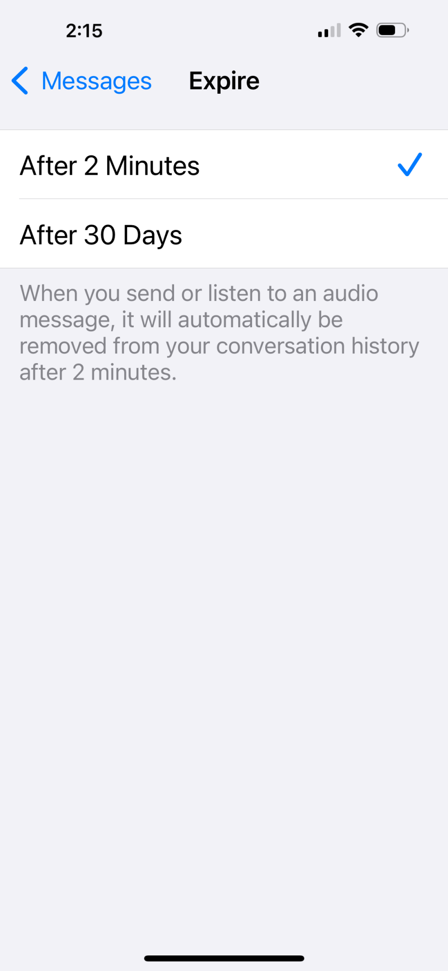My family and friends, who are also on iOS 18.2.1 all have the "After 2 minutes" and "Never" options