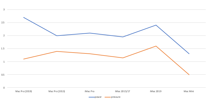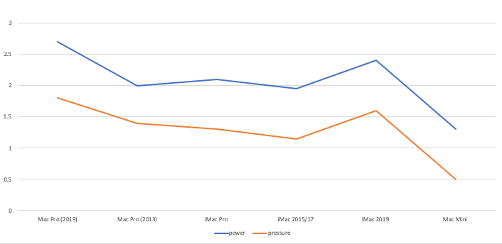 Comparing all the values on the chart below we can see the Mac Pro (2019) sound power level doesn't correlate well with every other computer, in which the values are quite closely linked: