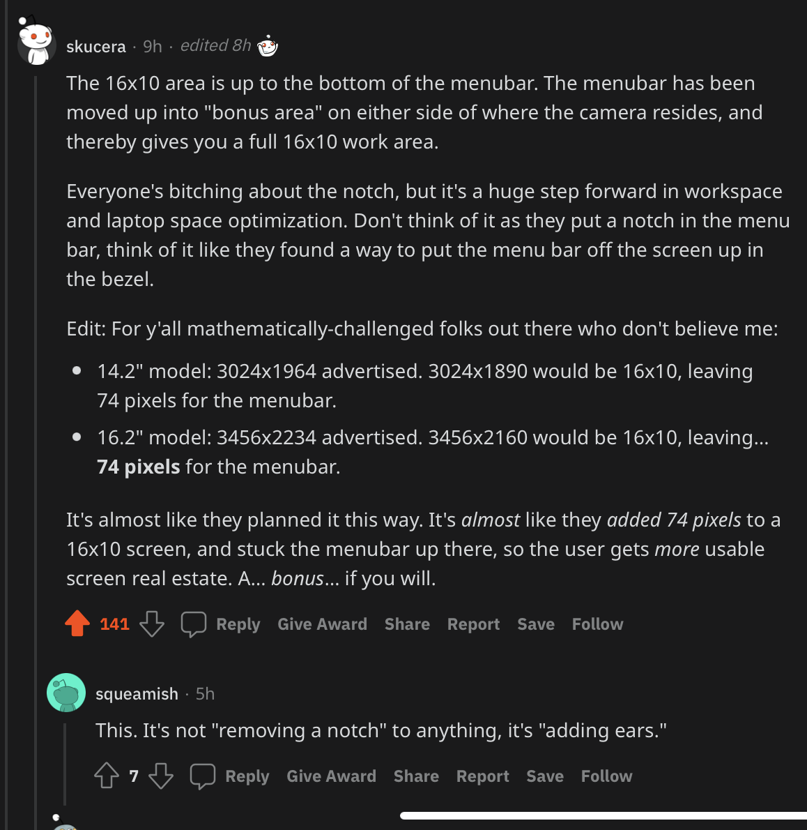 I'm not being vague at all, you're simply slow to grasp things.You are being intentionally vague. Every camera array causes the bezel to be thicker than if there were no camera (I challenge you to show me a case where this is not true). As I said in my earlier post, whether the gain is 74 pixels or 40 pixels or whatever, the result is the same. The camera is taking up some space that could be used for screen. The notch mitigates that in a way that (on a Mac) has no practical negatives.