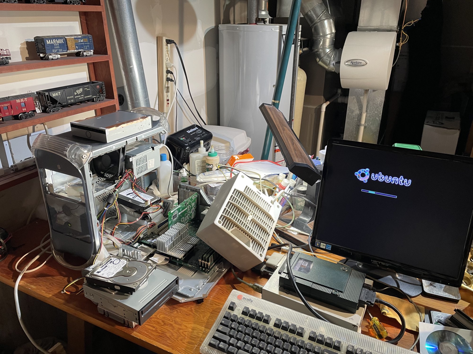 And make it all fit. What you are looking at is the shell of a 450MHz G4, running off a power supply from a Quicksilver G4 that died and the collection of DVD drives and hard drives that will eventually be mounted in the shell. I wanted to get the Operating systems installed first as the process required connecting and disconnecting the DVDRWs and hard drives in such a way that openBSD would boot with “boot hd:,ofwboot /bsd.”