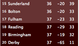 I should have put a fiver on Fulham.Derby is a given, I think Fulham though will just survive... leaving Sunderland and Middlesbrough occupying the other two relegation places. Or maybe not.