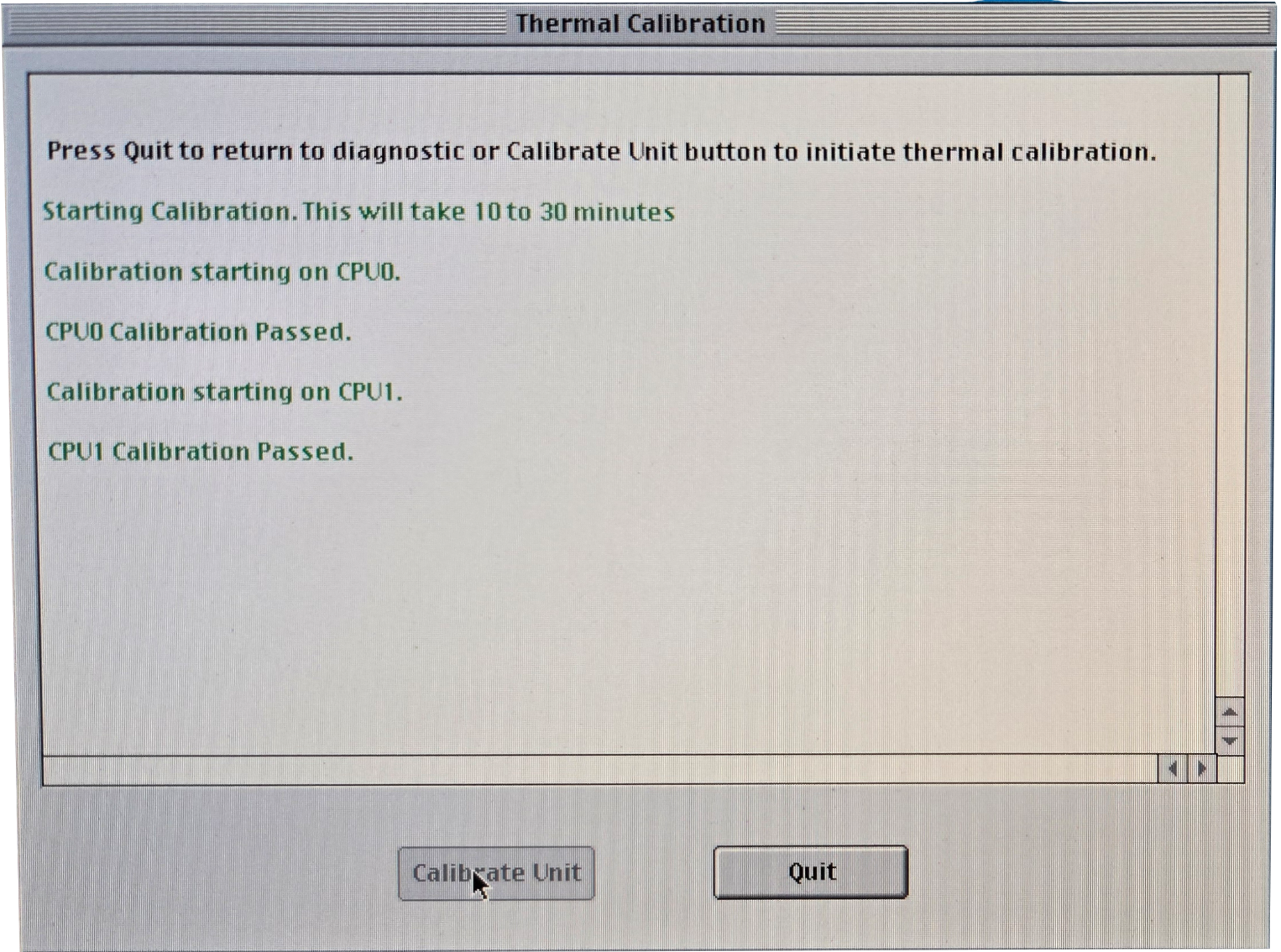 BTW, Thermal Calibration did in fact fail, but it was not without value and impact. Thermal Calibration rewrites the data in the calibration ROMs to match current circumstances, and this had the effect of lowering the idling fan revs on my new Quad from 3300 RPM to about 2200 RPM. This is still rather more noisy than I want to deal with, and so the LCS work is definitely "on", but it is an improvement. If you have a Quad whose fans are running just a small amount too fast, Thermal Calibration may just bring fan revs back to a more peaceful level. Remember however, as the Apple diagnostics guide says, you cannot calibrate your way out of a failing LCS; you may be able to buy some time, but eventually, the unit has to be serviced.