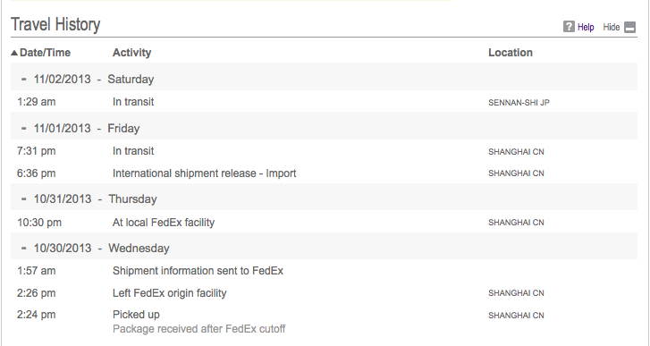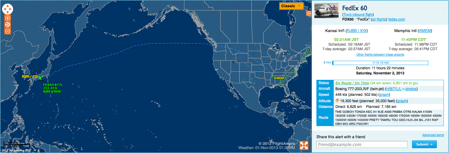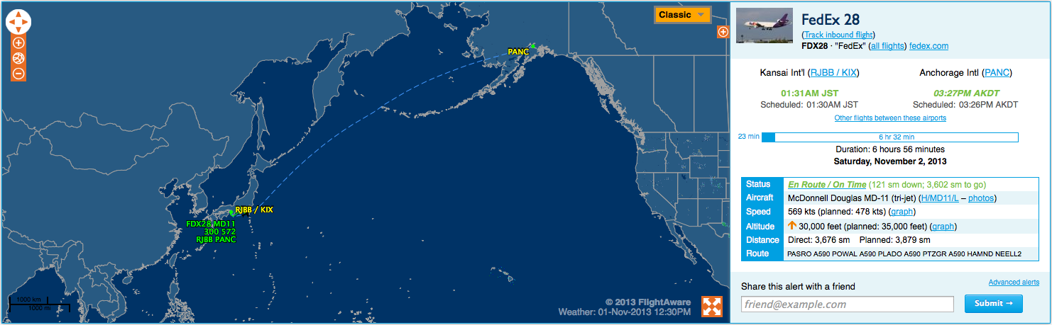 Just left Sennan, JP via Kensai Intl presumably on FedEx#28 to Anchorage Intl or hopefully on FedEx#60 to Memphis. My assumption is that, if it goes to Anchorage, it will continue on to Memphis on FedEx#??. Then to the local distro hub in Florida.