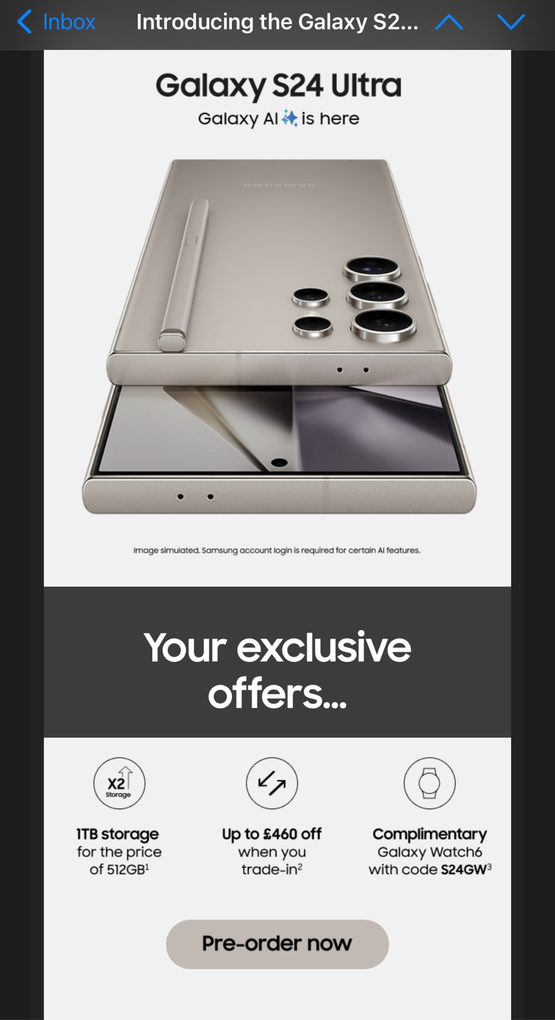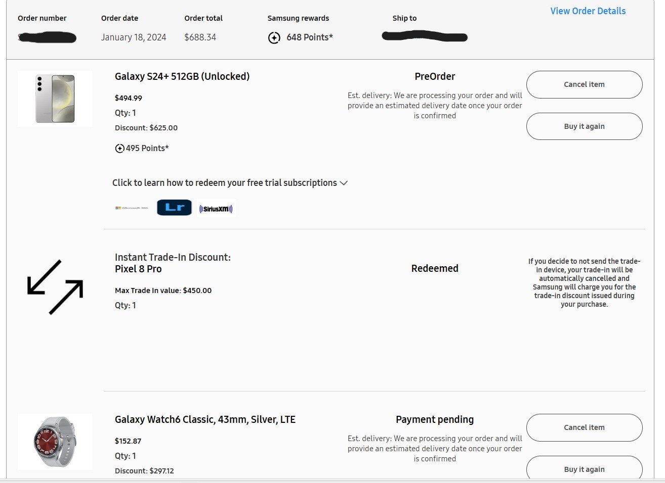The $50 off pre-order promo got emailed to me this morning, and Samsung added the Pixel 8 series to the eligible trade in devices. Decided to order the S24+ and Watch 6 for a grand total of $688 after all the promos, and also will get Rakuten 12% cash back. Apparently I got 10% Microsoft cash back as well. I love the look of the Watch 6 classic, who knows how my user experience will actually be, though.