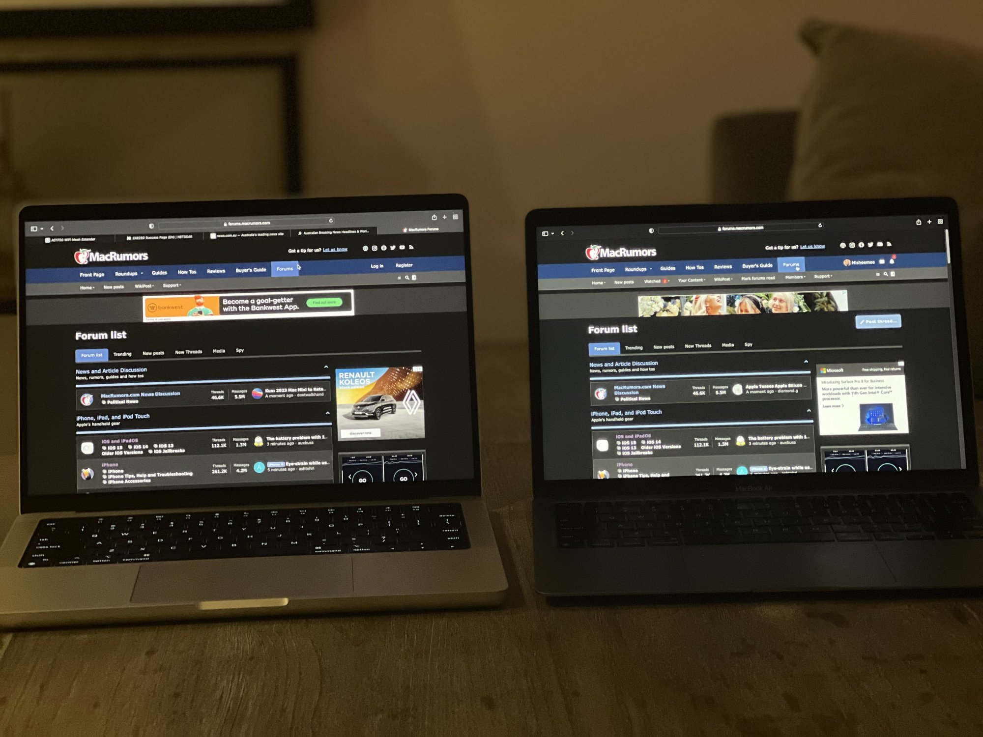 Base M1 Pro 14" on the right and Base M1 MBA 13" on the right