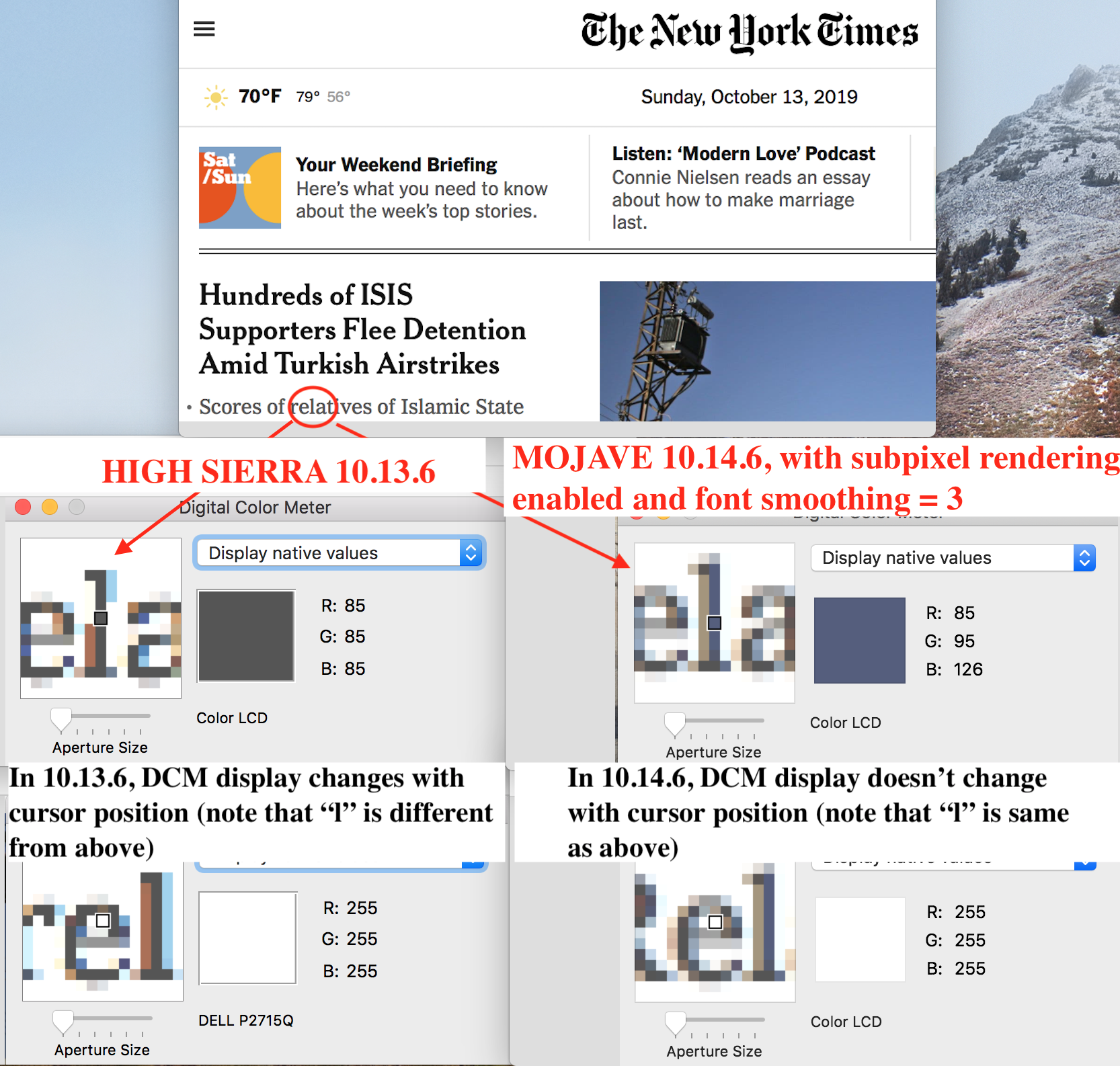 Take a look at the screenshot below. The NYT renders its bulleted text in gray. Here I used the Digital Color Meter to look at the the circled three-letter sequence "era" in "relatives". Look at the middle letter ("l"). In HS, the vertical bar of the letter is still gray. By contrast, activating subpixel rendering in M turns it blue.