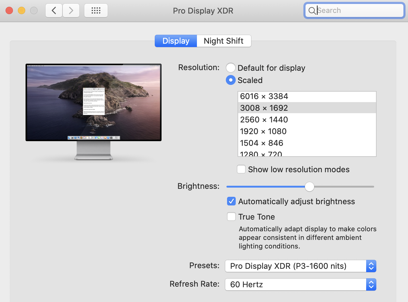 One thing that is a little surprising is that there are no resolutions between 3008 and 6016. Normally Apple includes some "more space" style options that have a lower DPI than true Retina (for example the 5K iMac goes all the way up to 3200 x 1800 of workspace, which is more than you get with the Pro Display XDR).