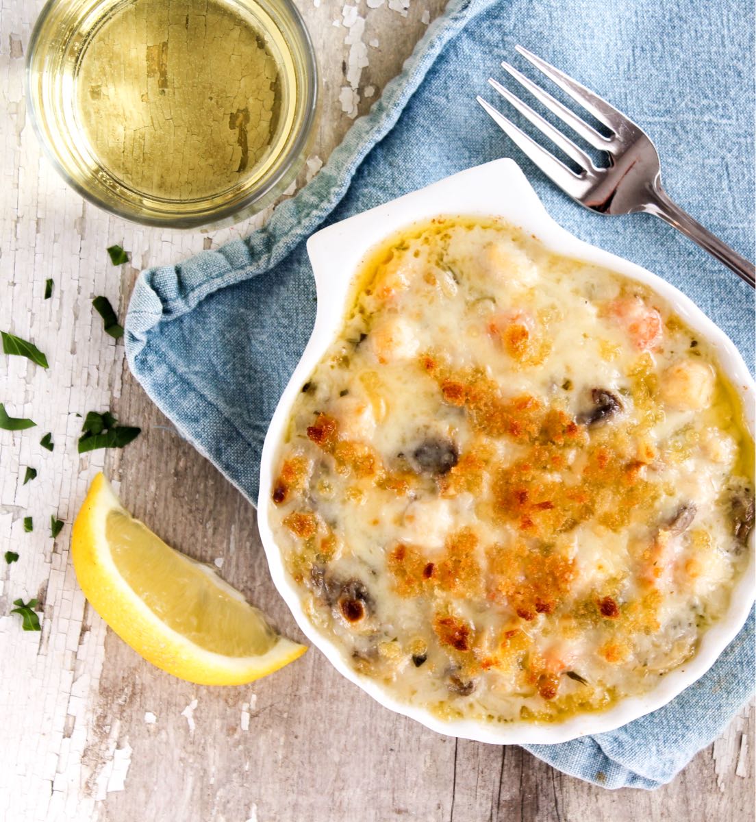 - Combine breadcrumbs with 1 Tbs melted butter; sprinkle evenly over scallop mixture.