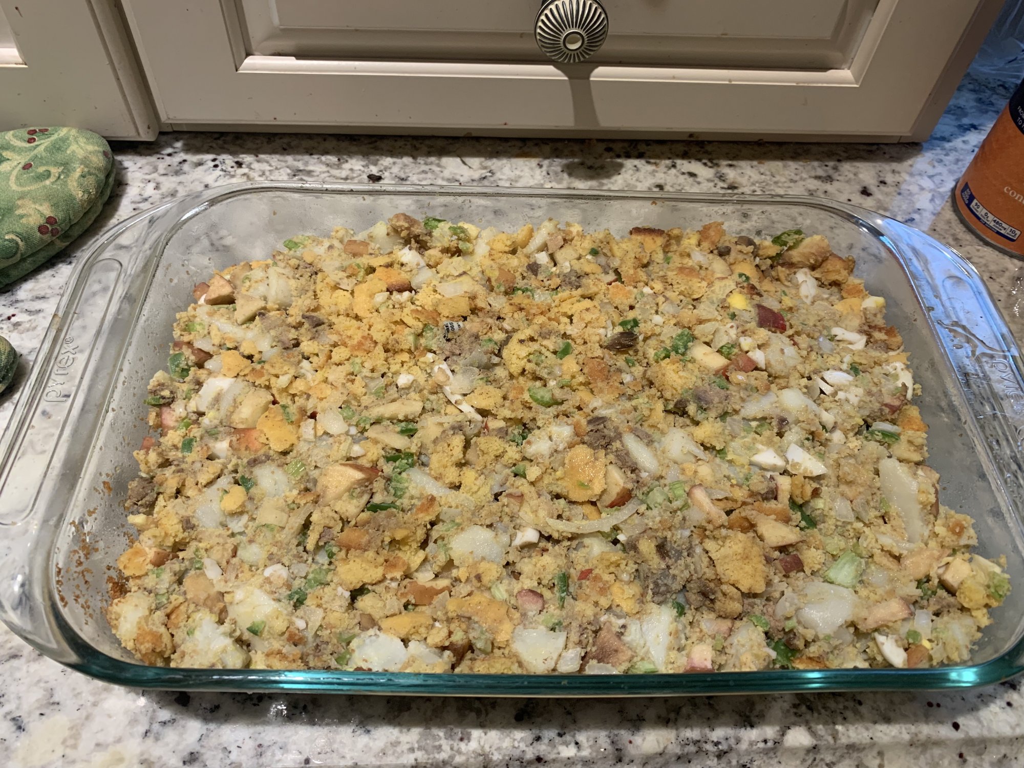 When I had the cheese grated, most of it (in two batches) was added to the already whisked eggs, and stirred and whisked. Add some freshly ground black pepper.