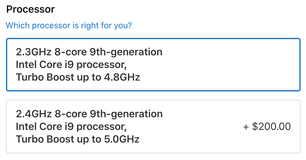 Intel's listed recommended customer price is $556.00 for the first part and $583.00 for the second. That $27 difference turn into a $200 dollar difference when upgrading the 16" MBP on the Apple store. Now keep in mind that Apple most likely pays nowhere near those prices for the volumes they are ordering, and in reality the difference should be less than $27.