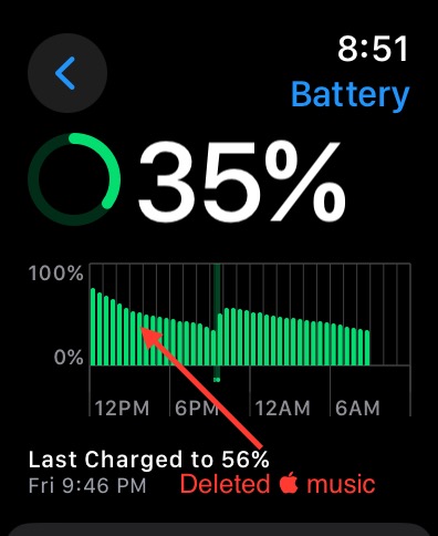 While this seems extreme, I give you the below screenshots from my watch battery timeline. The first shows how bad this was. Every day the drain would be horrible. The second shows what it looked like after deleting Music. You can totally see the inflection change. (The screenshots overlap a bit in time) Ever since I’ve deleted music, no more battery problems.