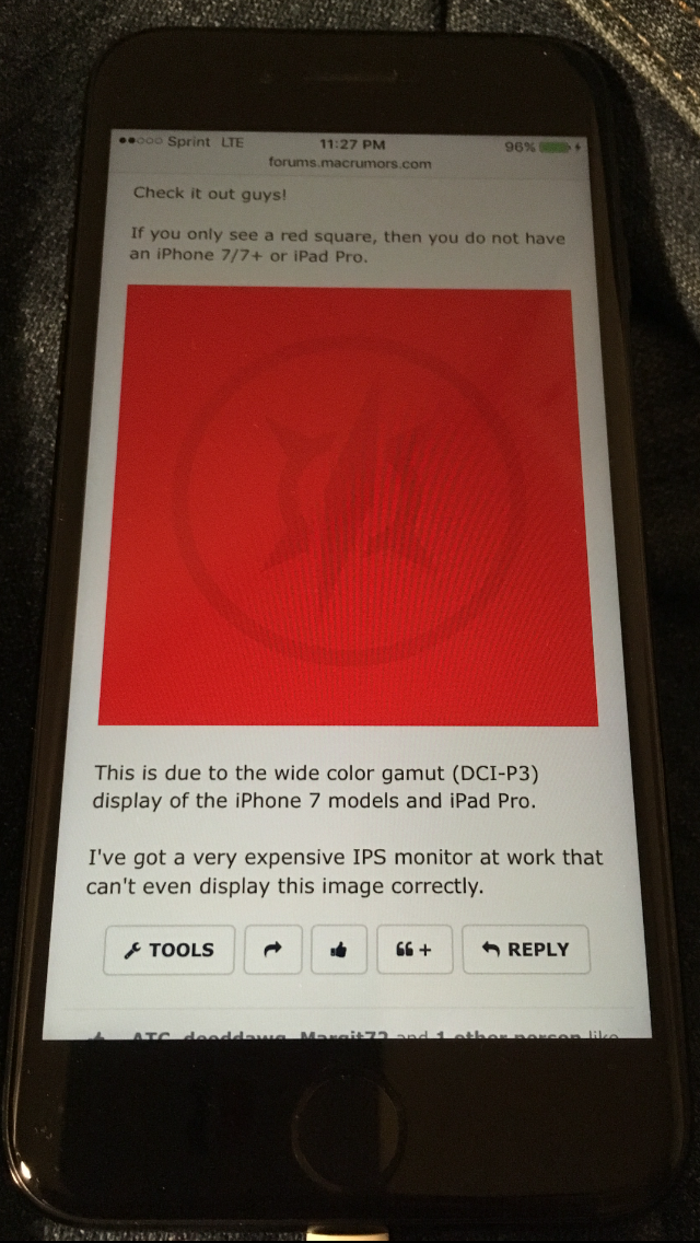The iPhone 7 has a wide gamut display meaning it has an expanded color palette.