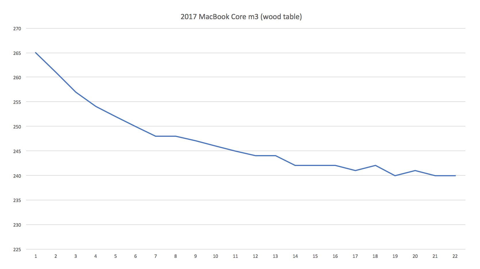 As I suspected, the table material makes a difference. The first time I ran the test on my 2017 MacBook Core m3, I ran it on a granite counter, and turned off WiFi and Bluetooth. I just ran it again, but this time ran it on a wood table (which would act more as an insulator, keeping the heat in), and kept on WiFi and Bluetooth.