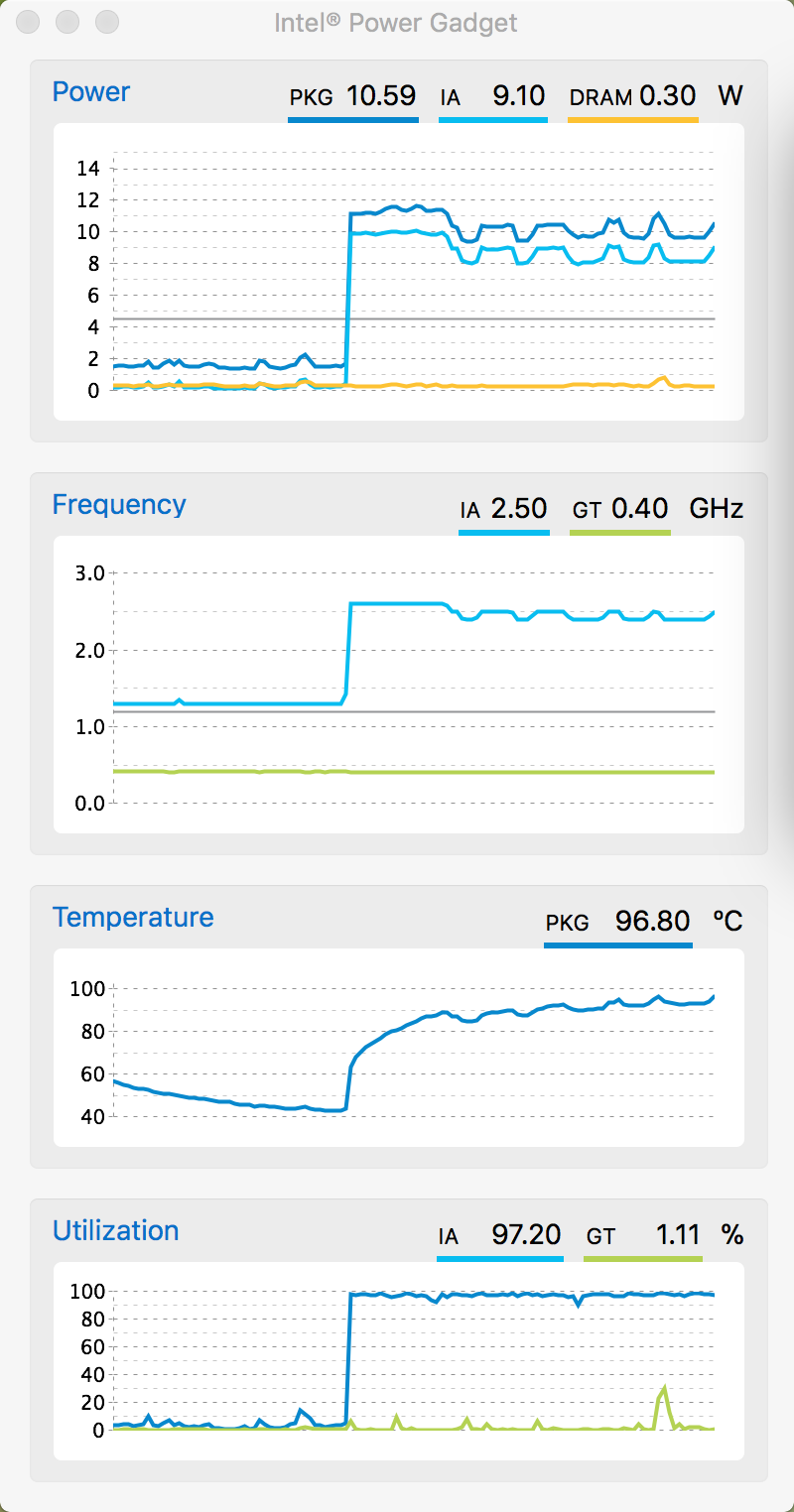 Those almost 100 degrees temps bothers me, but intel engineers know more than me.This is the latest Intel Power Gadget (Version 3.5, released 2017-12-22). Max speed with 4 x YES testing in the terminal is 2.6 GHz, which then throttles to 2.4-2.5 GHz.