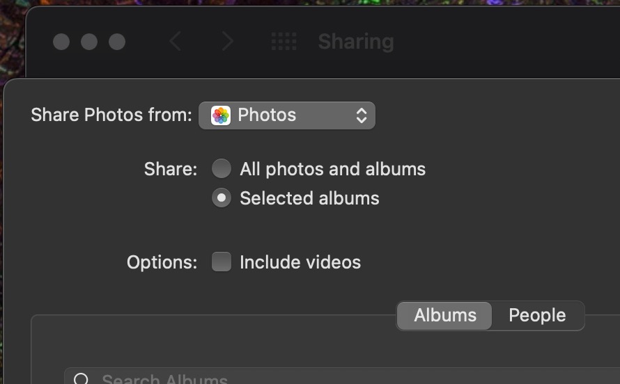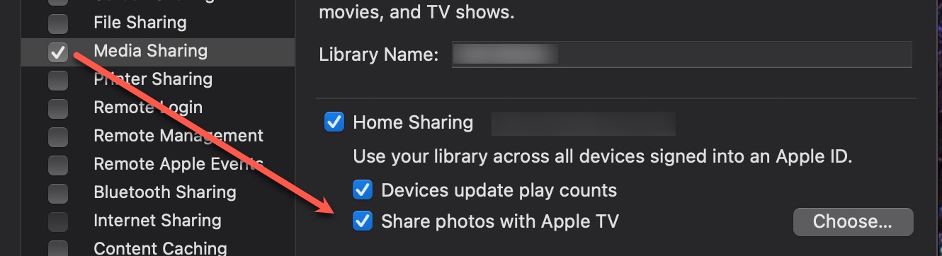 - if on macOS since about Catalina, that same functionality moved into Settings, Sharing, Media Sharing, check box for share photos with appletv and optionally, click "Choose..." to identify if you want to share ALL photos in your collection or only some albums. Here's what that looks like...
