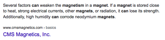 In this attached image it states: "Several factors can weaken the magnetism in a magnet. If a magnet is stored close to heat, strong electrical currents, other magnets, or radiation, it can lose its strength. Additionally, high humidity can corrode neodymium magnets".