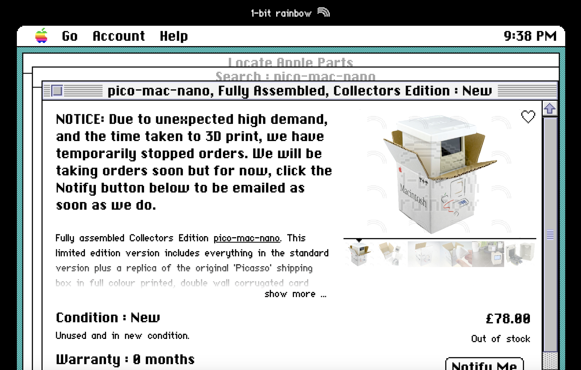 1-bit rainbow is selling the pico-mac-nano for £56, but it has gone out of stock after it received attention on tech blogs. The website says orders will resume "soon," and you can enter your email to be notified. Or, you could create one yourself, as the pico-mac code and 3D-printable case files are freely available on GitHub.