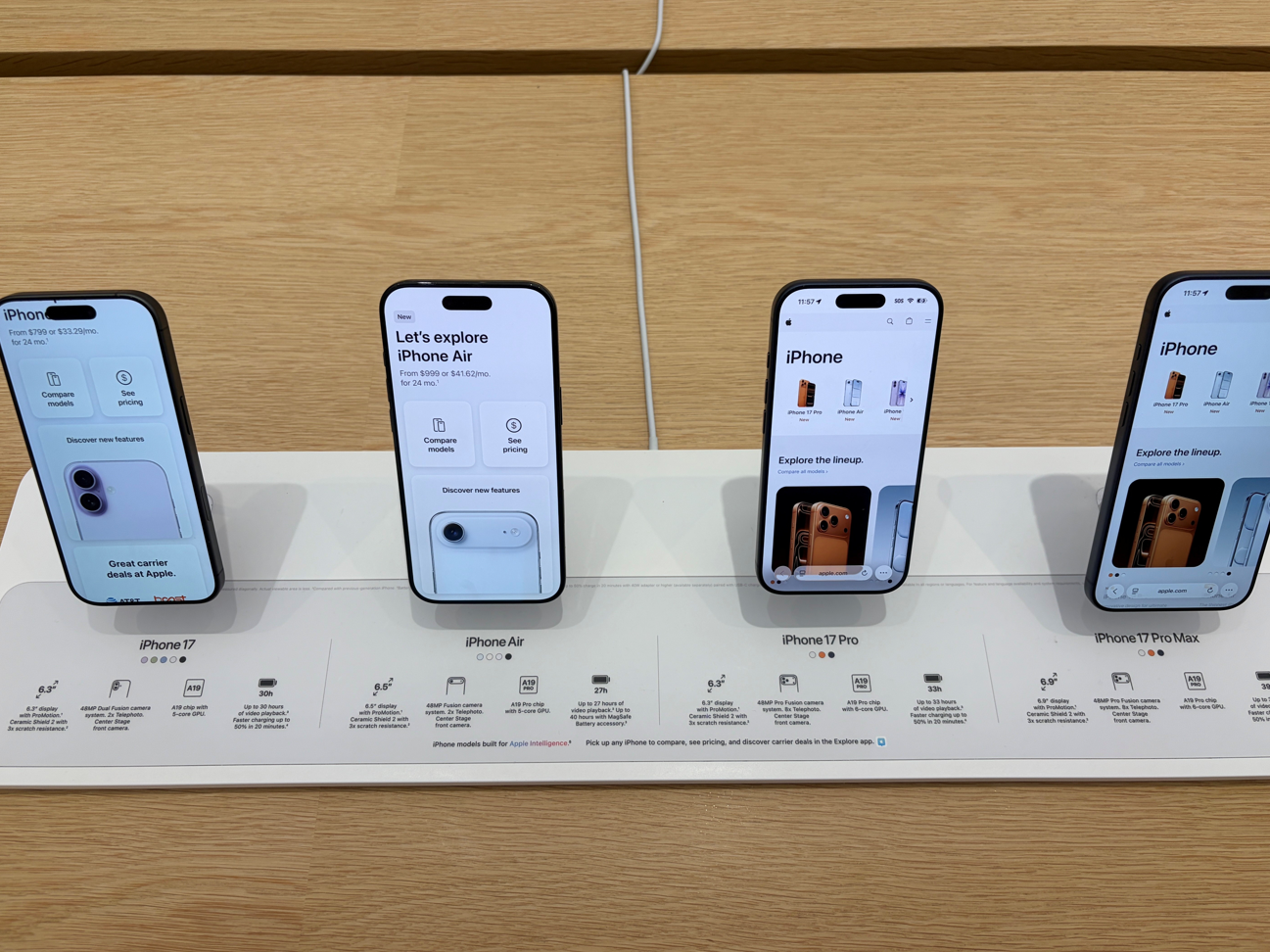 In the store at every station, this is what it looked like. The 17 Pro in all cases has a more consistent screen, and did not change at any angle. The 17 Pro Max gets very green from the side and especially when tipped forward. The 17 is a little green all over the entire screen and gets worse at an angle. The Air in this picture, was the most uniform of all the set ups at the store, and a little better than the Air I currently have.