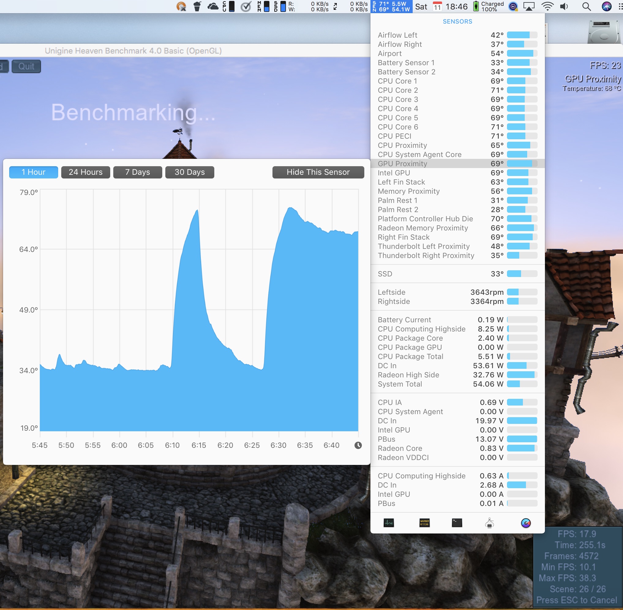 I've set the fans to 4626 and 4263 rpm in Macs Fan Control and run the benchmark 4 times. Ended up with 59 C on GPU, and CPU cores around 60C. 560x was at 72C GPU and 74 on CPU cores. So thats actually 22% temp increase for 17% gain, I mean in this benchmark, but it gives a general idea. I actually like the fans at those settings, they're not too loud but the keyboard remains cool to the touch. I think apple is too skittish with fan curves.