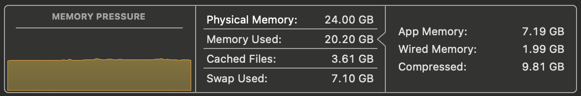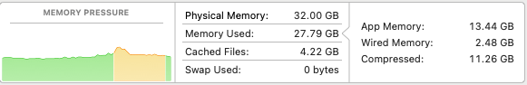 Attached screenshot of the memory usage from activity monitor. It seems the CPU is doing just fine, but it does seem like memory pressure is up there? I think I noticed a little blip into red, but otherwise it stayed into yellow? But also used GBs of swap over a not-too-long time?