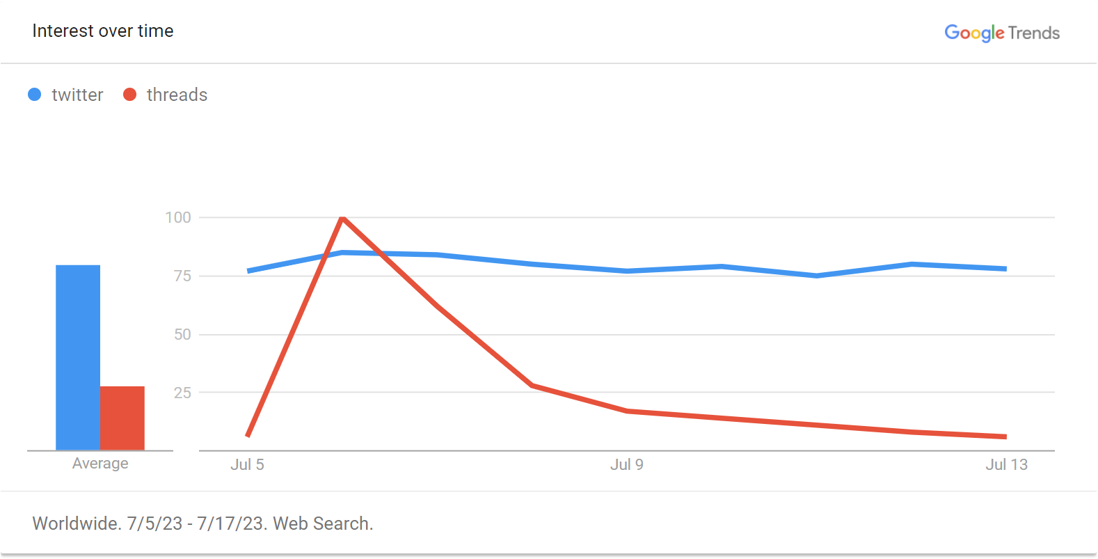 Isn't that just web searches? Of course Twitter is going to be always trending, have you seen what's going on over there? Between renaming it to a letter and putting up and taking down a giant X sign and challenging Mark Zuckerberg to a cage match, Musk has made sure that he is always in the news (and surely that is the whole reason he's doing all this crap.)True. It did but check this chart. The app is half-baked. That’s it. View attachment 2243075