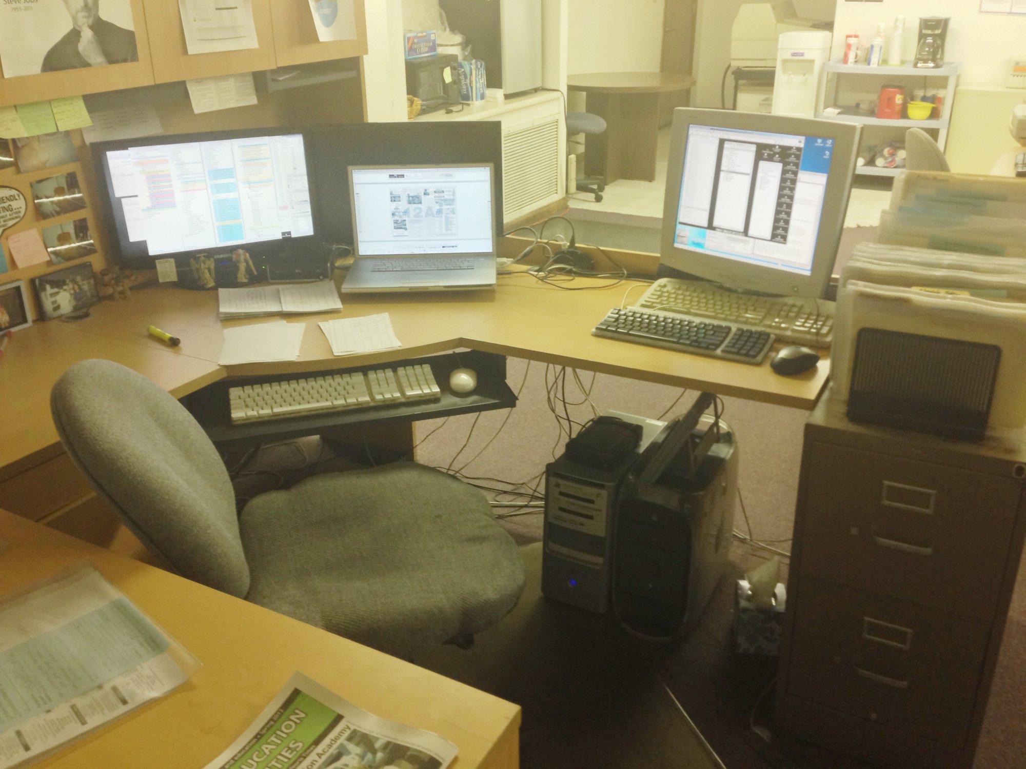 LOL! This was 2013, seven years after the first Intel Mac.It's always very interesting to see photos of retro macs (in work environments) back in the day!