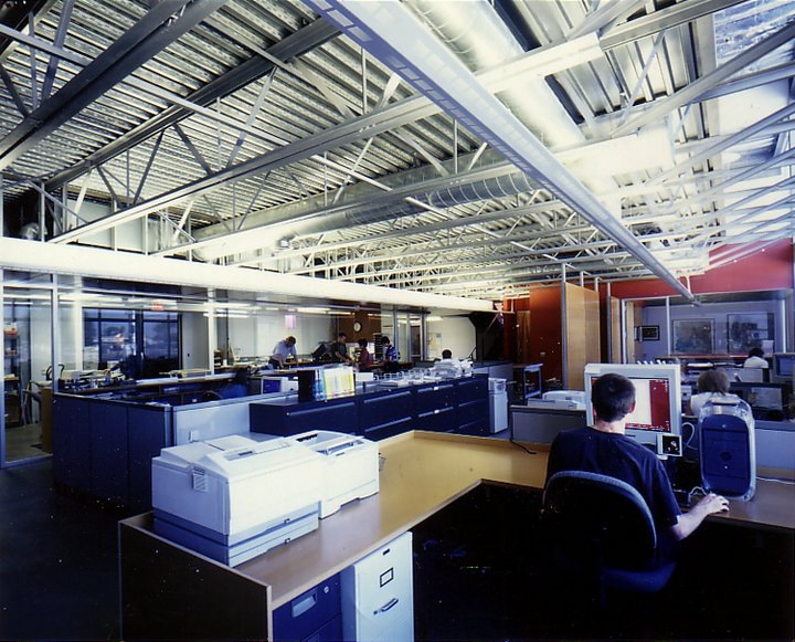 The building itself was concrete, metal and glass. That series of windows to the left, that space ran the entire length of the building (to the breakroom which you can't see) and there were large doors behind that allowed for large deliveries. The space was where everything was sorted. ACT wasn't just a newspaper that covered the capitol, but the company offered (still does) several services to lawmakers. Briefs and summaries on bills, up to date corrections that the legislature was working on, etc.I see pictures like this and I cant help but think that in just a few years between ASI and refined VR technology, everyone is just going to be standing around in goggles with unlimited, collaborative virtual spaces at their fingertips and scenes like this will be "the old way".