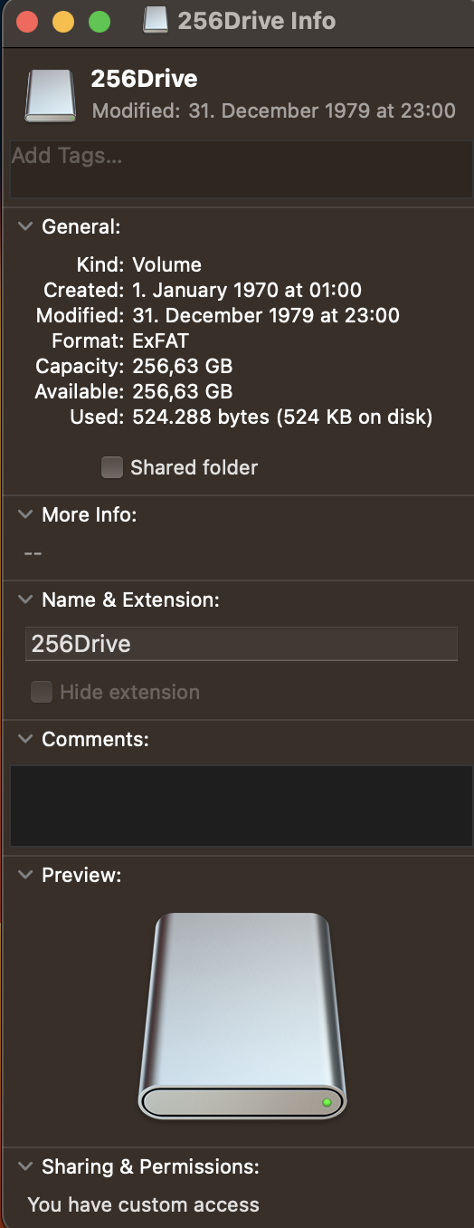 I've a Samsung Duo Plus 256GB that in all honousty hasn't been used that often or is very old. I did today however reformat in ExFat using Disk Utility and have taken a screenshot of Get Info: