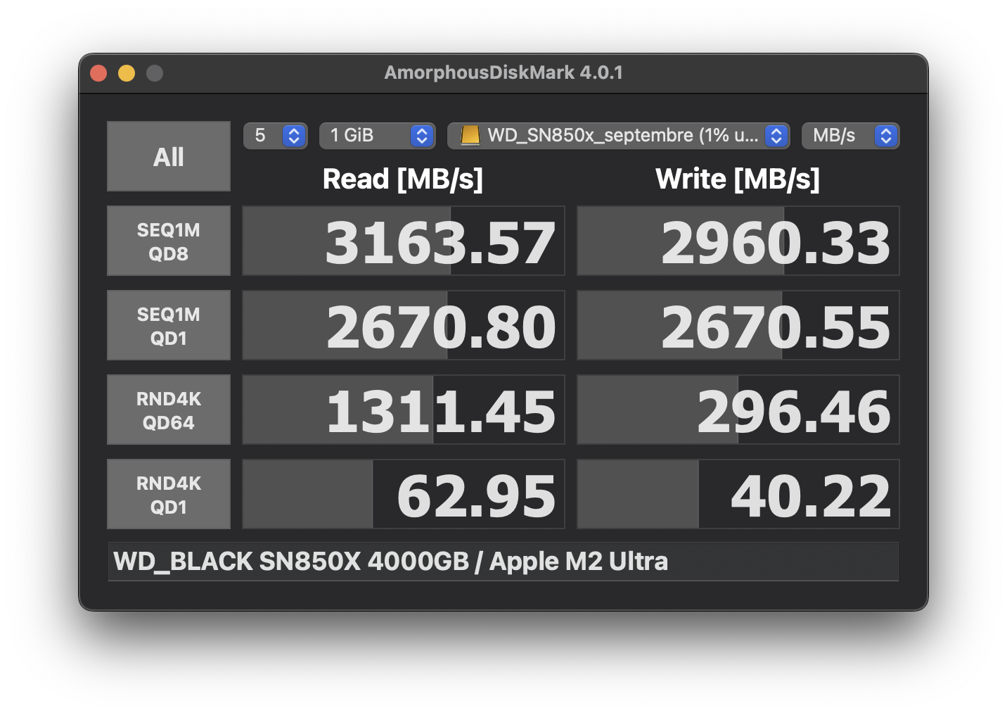 And these are my AmorphousDiskMark results for the TBU-405/SN850X 4TB combo, on a M2 Ultra Mac Studio :