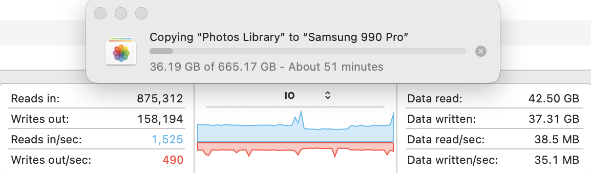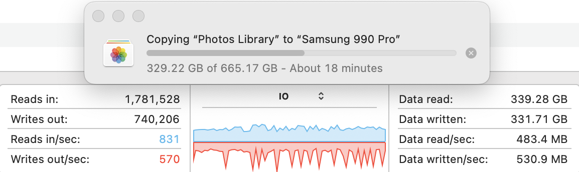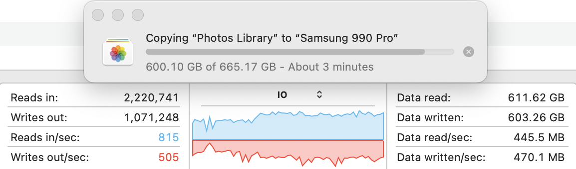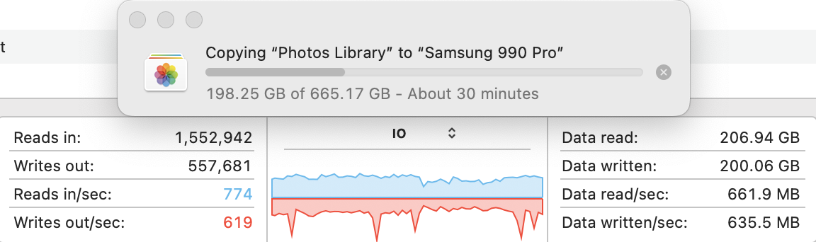 I transferred my 665.17 GB Photos Library from my Samsung T7 Shield to the new USB 4 Samsung 990 Pro. It took 29'45" for the complete process, or 29'11" for the actual transfer (since it took 34" for the transfer to be prepared). So that means a transfer speed of 373 MB/s or 380 MB/s depending upon how you calculate it. However, the speeds and behaviour really ranged, probably because of the types of files transferred inside that library. Here are the various transfer speeds at different points in time during the transfer. The graph shows the variability in the transfer speed.