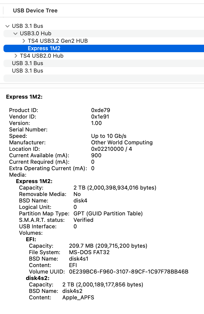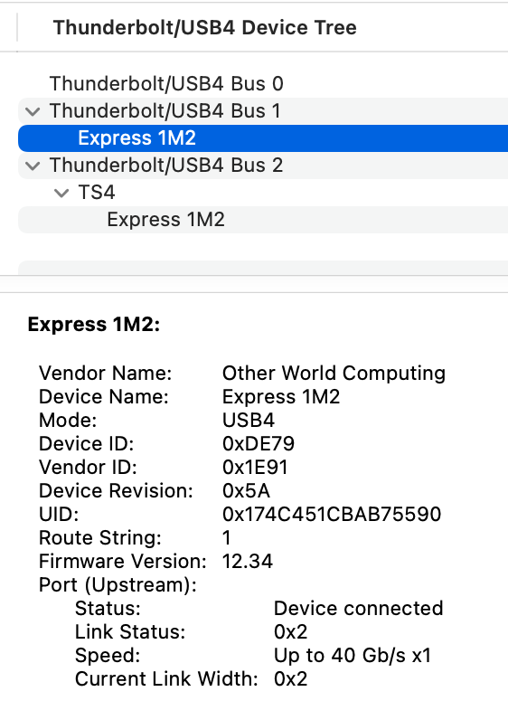 So, with that enclosure, I get TB when attached directly to the MBP, but USB when attached to the TS4 (no matter which cable or port is used). Meanwhile, the other Express 1M2 does give me TB on either TS4 port and either cable.