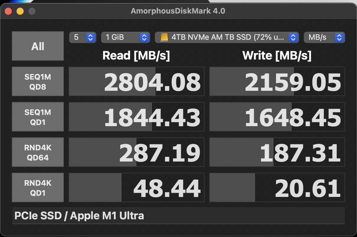 I bought the Orico USB4.0 NVMe SSD enclosure and a 1TB Samsung 980 Pro SSD to add to my external drives. Before putting the 980 Pro in the Orico enclosure, I tried the 960 Pro in it to see if the bottleneck was the Envoy. As you see in the attached screenshot, the read speed improved dramatically, from apex. 1550 MB/s to 2675 MS/s, but the write speed stayed about the same, 651MB/s.