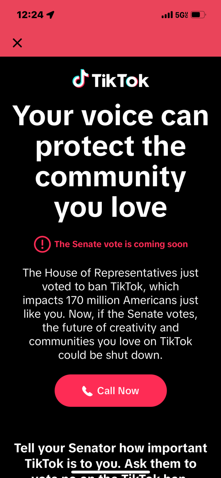 While the message seems innocent enough ("call your representative and tell them to stop the TikTok 'ban'"), its success in getting people to actually do just that could be considered propaganda, and it's not far-fetched to imagine the CCP using such a tactic to further their dictatorship while destabilizing our democracy.
