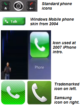 And yes, a white on green left leaning phone icon was used by Skype and in Windows Mobile dialer skins, before the iPhone came along and did one as well. Apple had to add stripes in order to get a trademark on their version. The one they used at the iPhone debut in 2007 was too common.