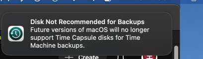 Anyone else gotten this? Clicking the prompt takes you into Time Machine settings and offers a 'more info' page to read, but doesn't explicitly say anything about Time Capsule or what alternatives you require.
